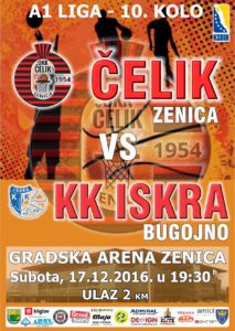 OKK Čelik – KK Iskra subota 17.12. 2016.godine u Areni Zenica na centralnom terenu, sa početkom u 19,30 sati. Ulaz je 2 KM.