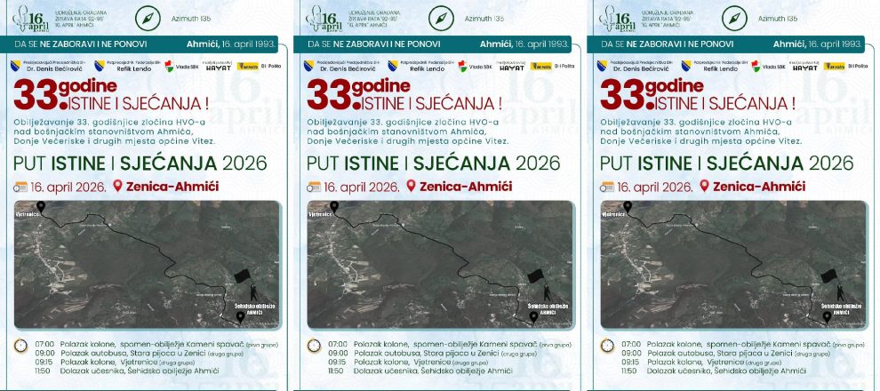 U okviru obilježavanja 33. godišnjice zločina HVO-a nad bošnjačkim stanovništvom Ahmića, Donje Večeriske i drugih mjesta općine Vitez, organizuje se planinarska tura pod nazivom “Put istine i sjećanja Zenica – Ahmići”, koja će biti realizirana u dvije varijante.