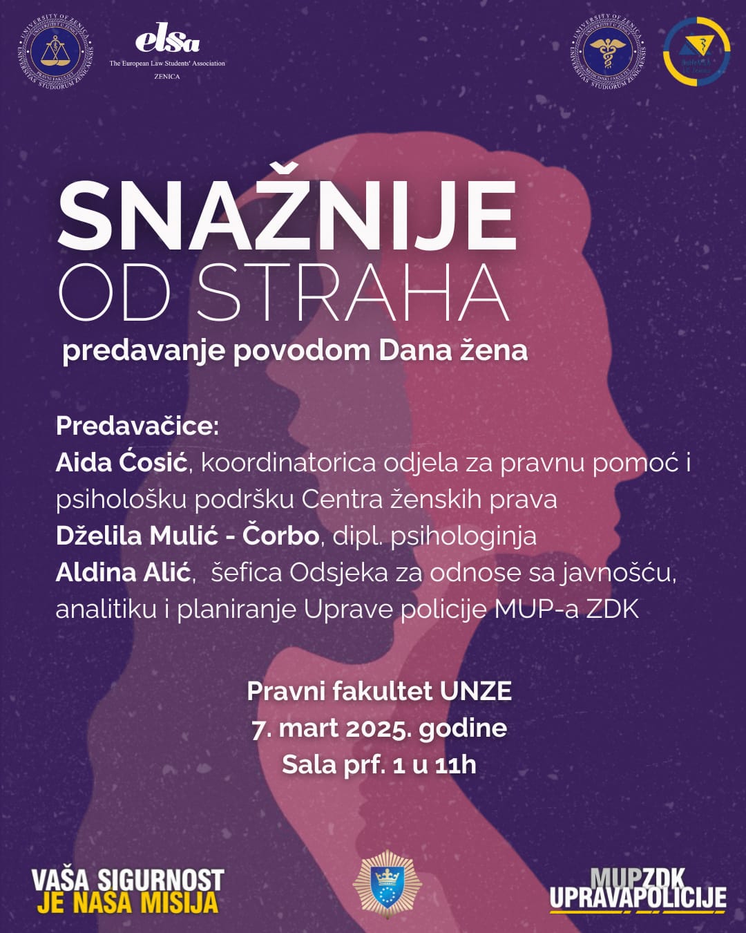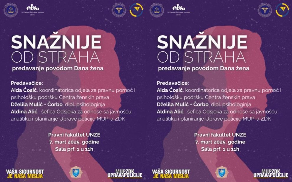 NAJAVA: Predavanje povodom Dana žena “Snažnije od straha”- Povodom Dana žena, 7. marta 2025. godine na Pravnom fakultetu Univerziteta u Zenici planirano je predavanje “Snažnije od straha”.