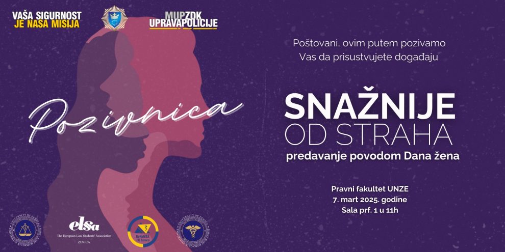 NAJAVA: Predavanje “Snažnije od straha” na Pravnom fakultetu Zenica- U organizaciji ELSA Zenica i u saradnji sa udruženjem BOHEMSA planiran je događaj povodom Dana žena.
