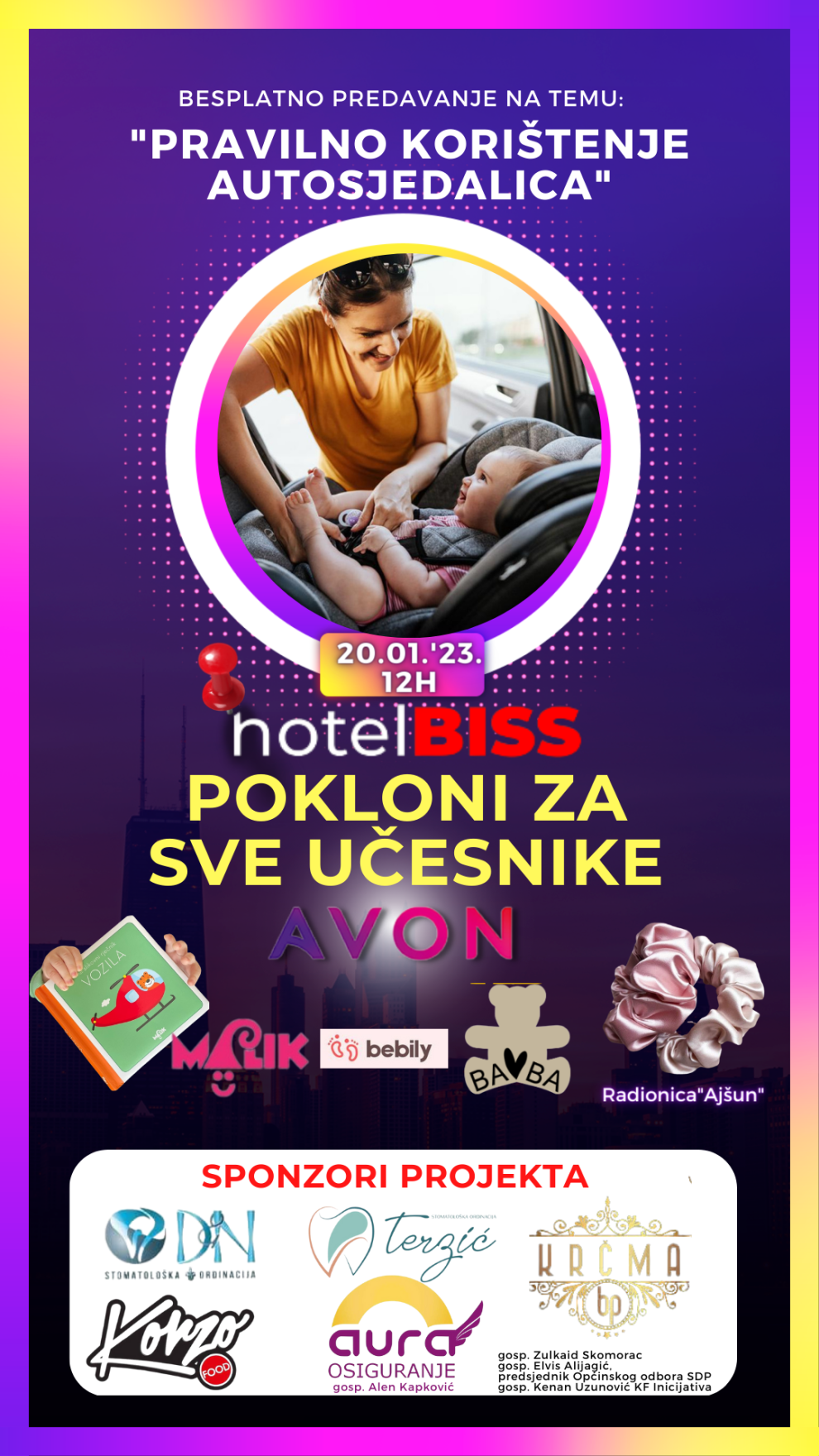 Pozivamo sve roditelje grada Zenice, kao i sve one koji to uskoro planiraju postati, da u petak 20. 01. 2023. prisustvuju projektu “Sigurnost djece u saobraćaju”. U sklopu projekta biće održano predavanje na temu: “Ispravno korištenje autosjedalica”. Predavanje će biti održano u konferencijskoj sali hotela Biss (ul. Vatrogasni put 1) u 12 sati.