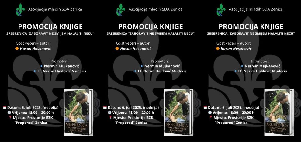 U sklopu obilježavanja 30. godišnjice genocida u Srebrenici, Asocijacija mladih SDA Zenica organizuje promociju knjige „Srebrenica – zaboraviti ne smijem, halaliti neću“, autora Hasana Hasanovića – preživjelog genocida, svjedoka boli, ali i glasnog čuvara istine o julu 1995. godine.