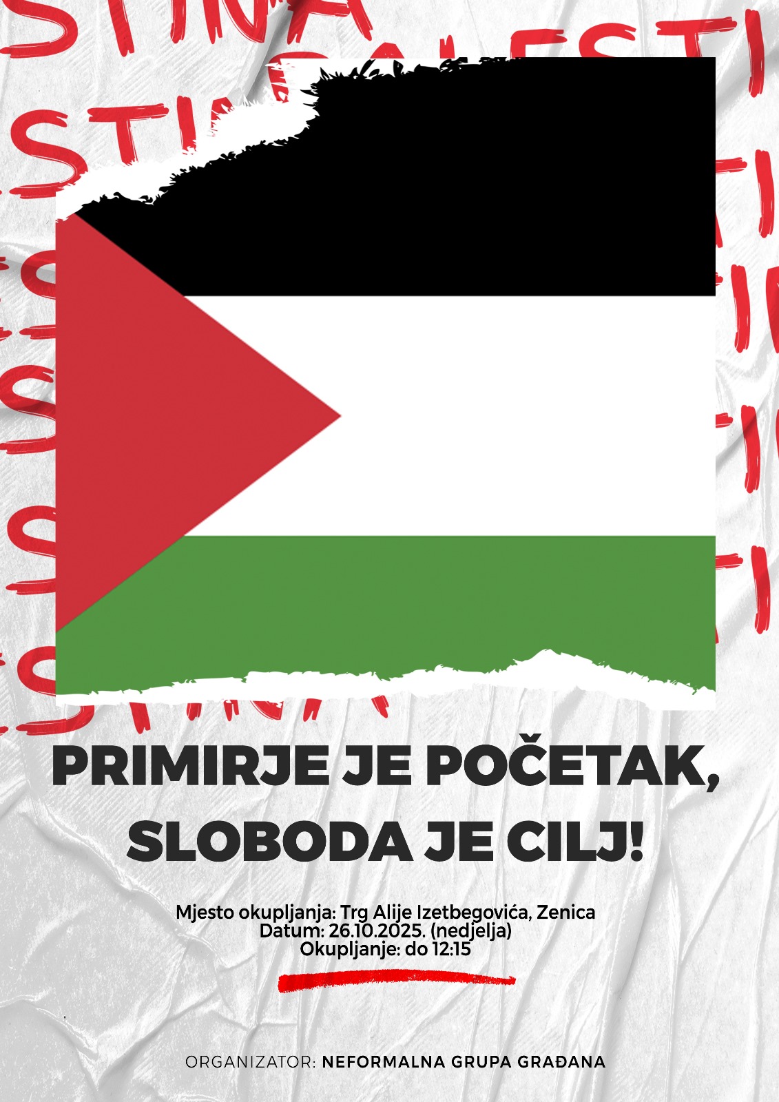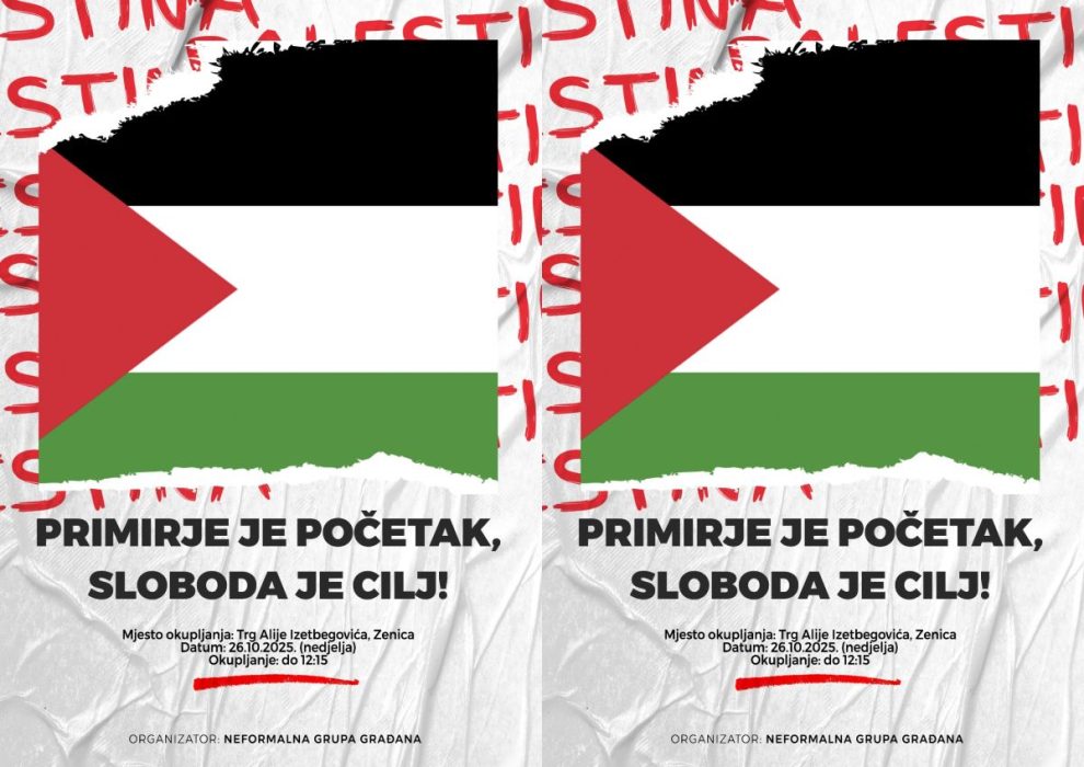 NAJAVA: Protestne šetnja „Primirje je početak, sloboda je cilj“ u Zenici- U nedjelju, 26. oktobra 2025. godine, biće održana protestna šetnja „Bosna i Hercegovina za slobodnu Palestinu“. Okupljanje učesnika planirano je do 12:15 sati na Trgu Alije Izetbegovića u Zenici.