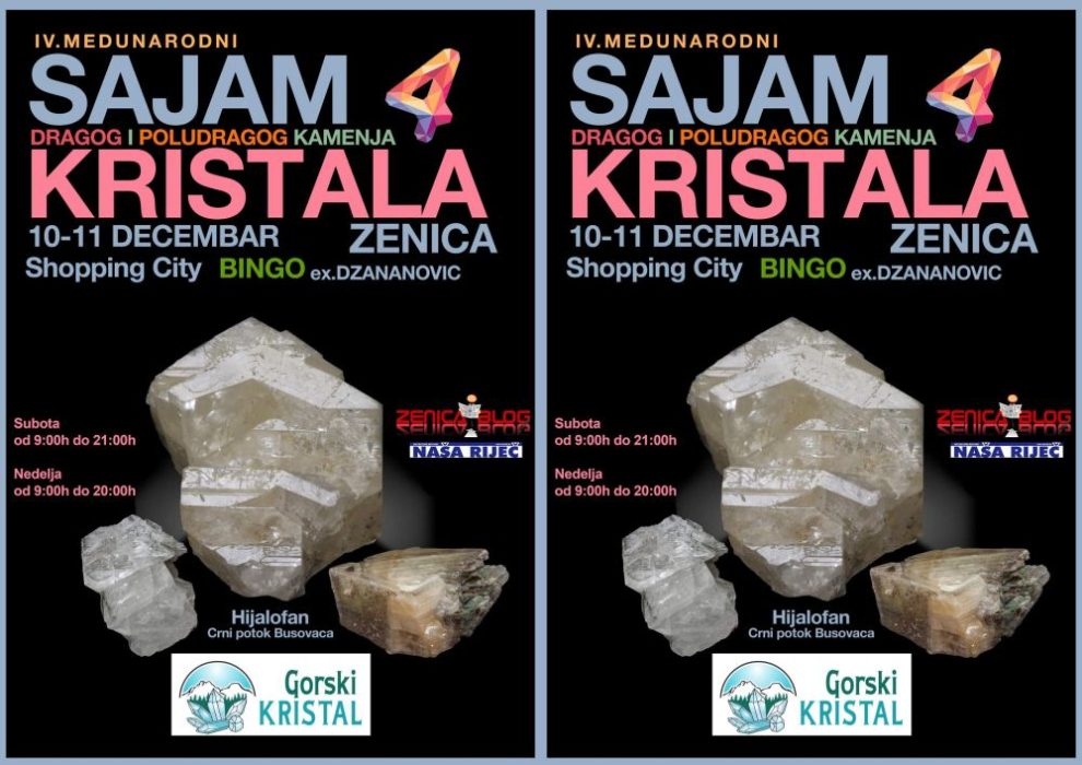 Naredni vikend, tačnije 10. i 11. decembra 2022. godine će se u Zenici u Bingo Shopping Cityu, održati Sajam Kristala i Minerala, dragog i poludragog kamenja, u organizaciji Udruženja građana ljubitelja kristala UG Gorski Kristal.