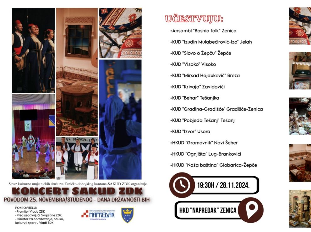 Savez kulturno umjetničkih društava Zeničko-dobojskog kantona – SAKUD ZDK, 28.11.2024. godine sa početkom u 19:30 u sali HKD Napredak u Zenici održava Koncert povodom 25. Novembra/Studenog Dana državnosti BiH.