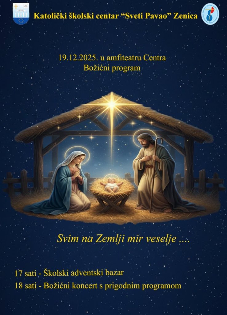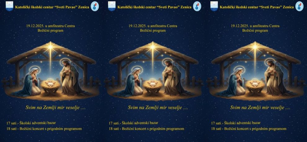 NAJAVA: Školski adventski bazar i Božićni koncert u KŠC-u „Sveti Pavao“ u Zenici- Katolički školski centar „Sveti Pavao“ Zenica, u petak 19. decembra 2025. pod geslom “Svim na zemlji mir veselje…” u amfiteatru Centra organizira prigodni božićni program.