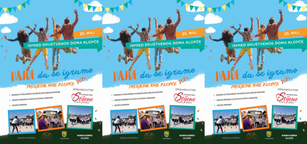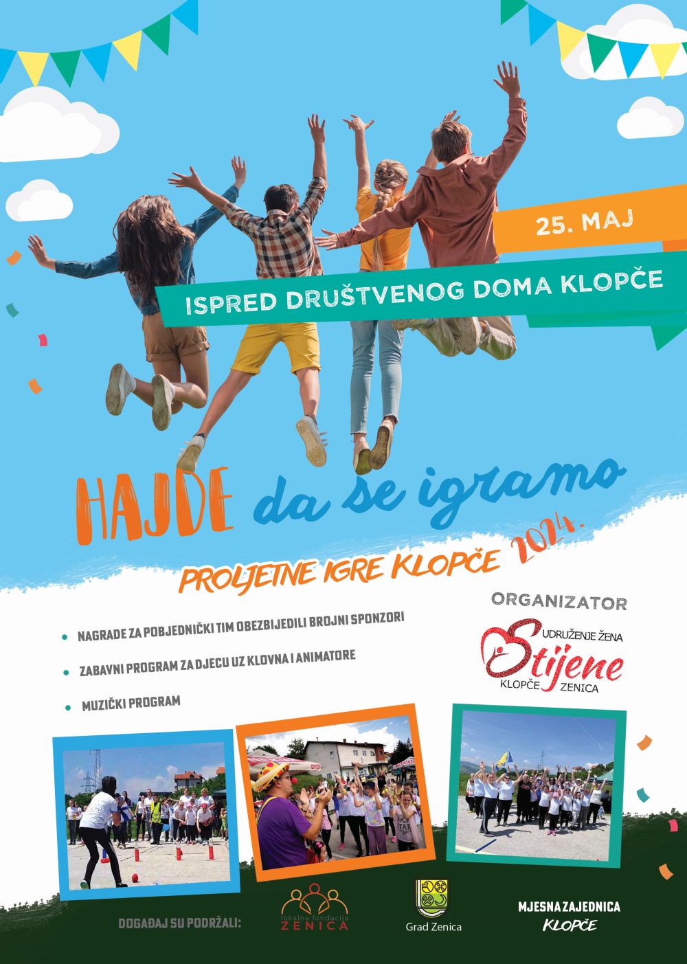 Nakon što su prošle godine “Proljetne igre Klopče” privukle veliku pažnju građana i građanki Zenice, Udruženje žena Stijene ponosno najavljuje drugo održavanje ove sportsko-zabavne manifestacije koja će se održati u subotu 25. maja ispred Društvenog doma Klopče.