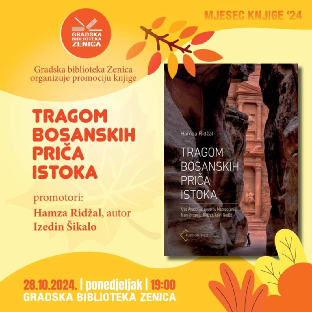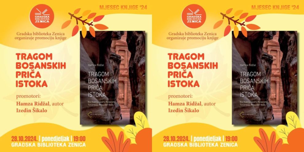 Svečana promocija knjige “Tragom bosanskih priča Istoka” autora Hamze Ridžala koja će se održati 28. oktobra 2024. godine u Gradskoj biblioteci u Zenici s početkom u 19:00 sati.