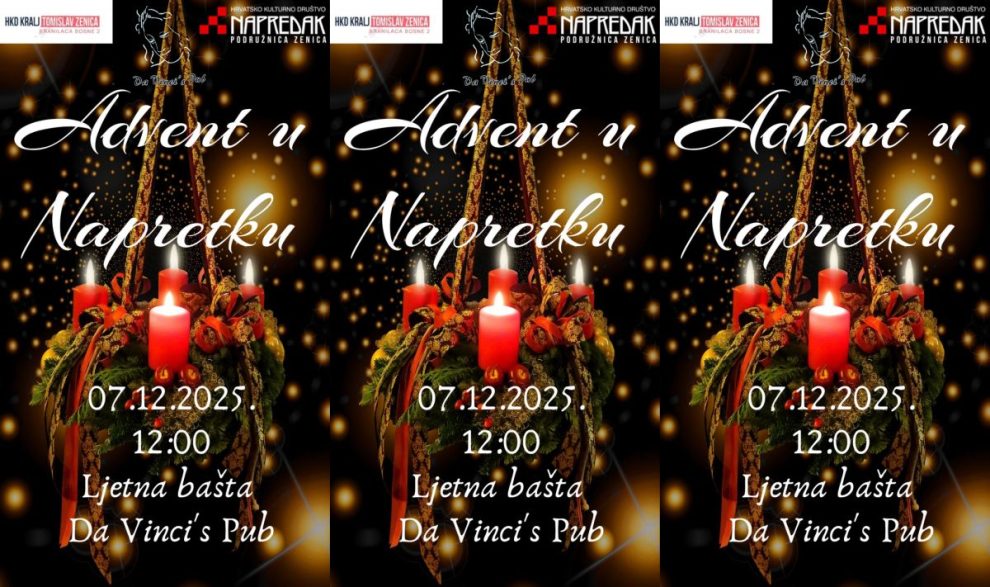 Hrvatsko kulturno društvo Napredak Podružnica Zenica, u saradnji s HKD “Kralj Tomislav”, najavljuje održavanje tradicionalne manifestacije “Advent u Napretku”, koja će se upriličiti u nedjelju, 7. decembra 2025. godine, u ljetnoj bašti Da Vinci’s Pub-a (Ulica Branilaca Bosne br. 2) s početkom u 12:00 sati.