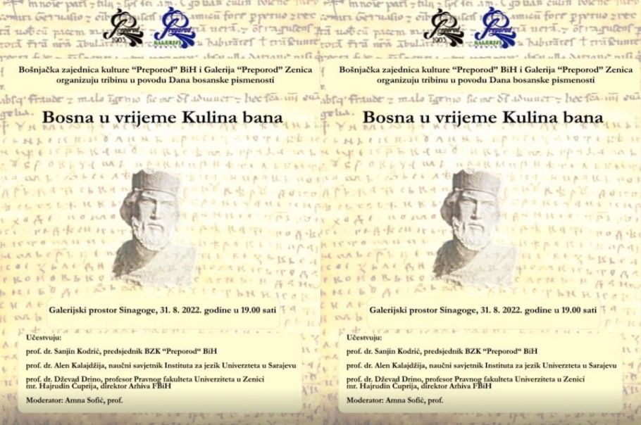 Galerija „Preporod“ Zenica u povodu obilježavanja Dana Zeničko- dobojskog kantona i Dana bosanske pismenosti u saradnji sa BZK „Preporod“BiH organizuje tribinu „ Bosna u vrijeme Kulina bana“.