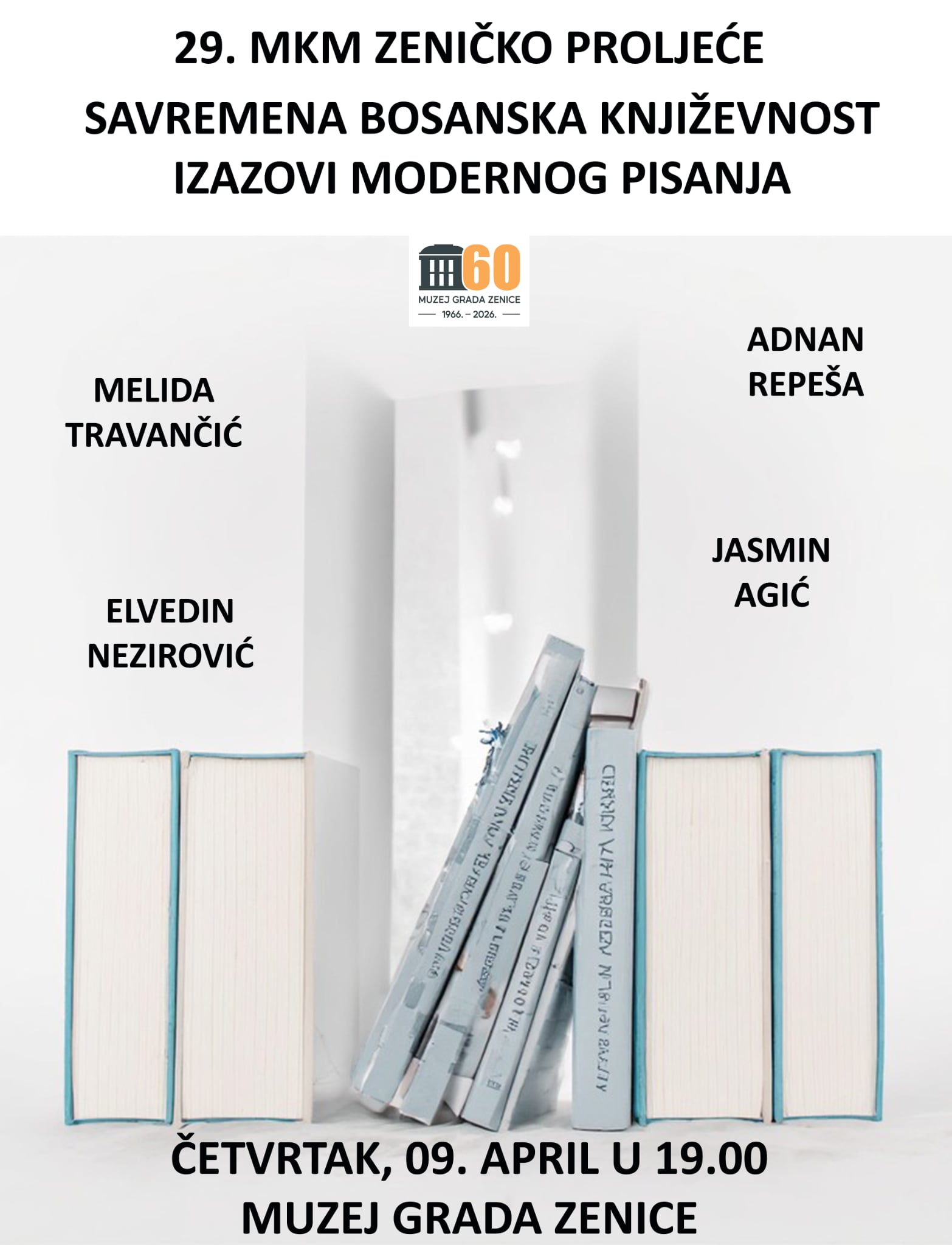 Tribina „Savremena BiH proza – izazovi modernog pisanja“ biće održana u Muzeju grada Zenice, u četvrtak, 09. aprila 2026 godine. Razgovor će početi u 19,00 sati. Ulaz je slobodan.