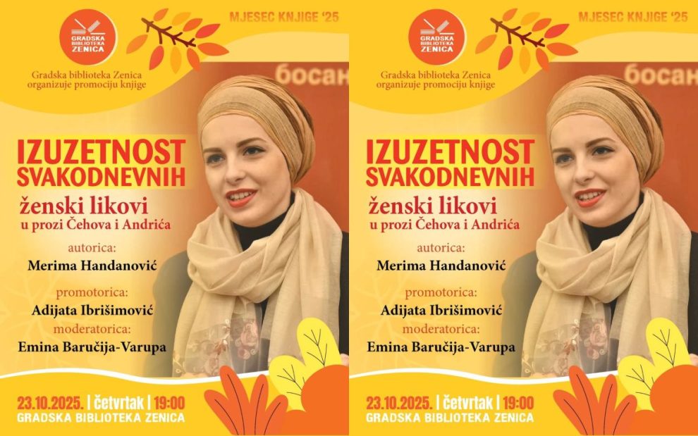 Nakon prve promocije knjige “Izuzetnost svakodnevnih: Ženski likovi u prozi Čehova i Andrića” u Kući nobelovca Ive Andrića u Herceg Novom, gdje je dr. Merima Handanović bila počasna gošća u okviru Herceg Festa, zenička čitalačka publika će imati priliku naredne sedmice da uživa u promociji naše sugrađanke.
