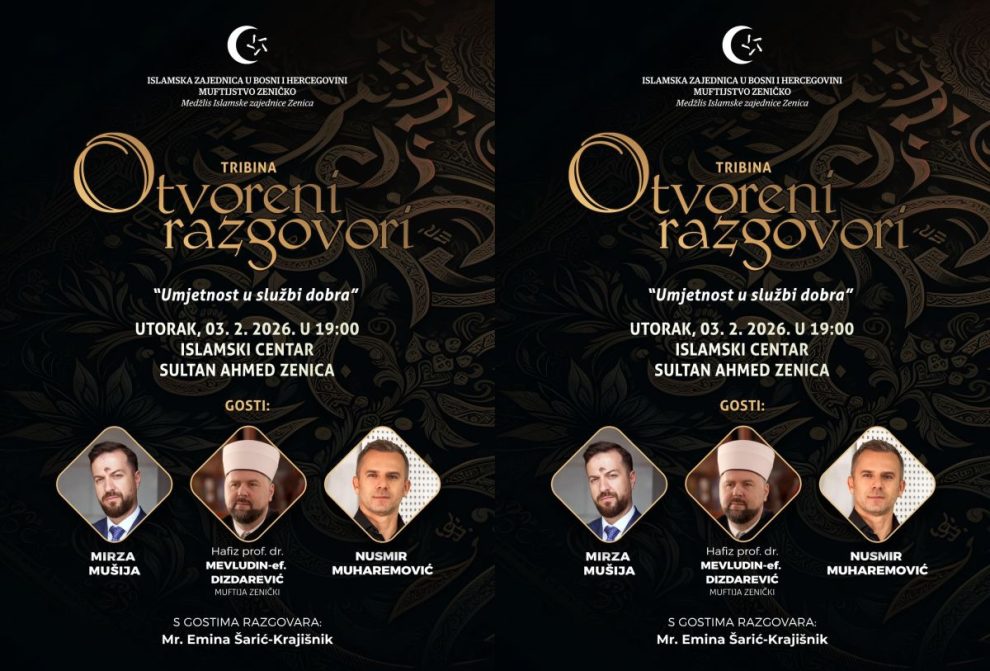 NAJAVA: U Zenici tribina „Otvoreni razgovori: Umjetnost u službi dobra“- Medžlis Islamske zajednice Zenica i Muftijstvo zeničko organizuju tribinu pod nazivom „Otvoreni razgovori: Umjetnost u službi dobra“, koja se realizira u okviru aktivnosti  s ciljem otvaranja prostora za dijalog u promoviranju univerzalnih vrijednosti, društvene odgovornosti i općeg dobra.