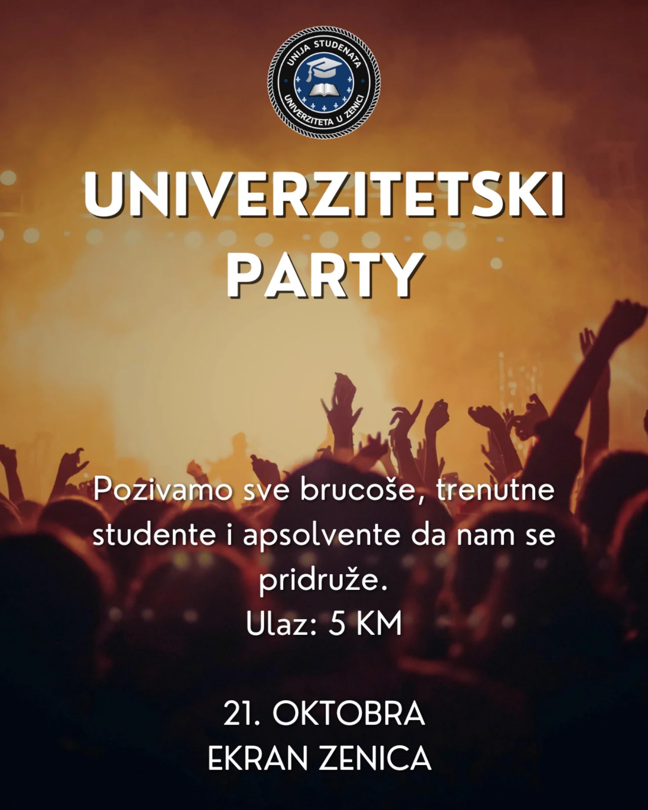 Članovi Unije studenata u Zenici su odlučili da ove godine organizuju PRVI UNIVERZITETSKI PARTY za sve brucoše, studente i apsolvente.