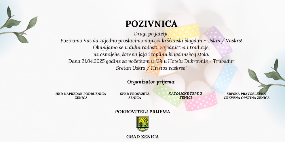 U organizaciji Hrvatskog kulturnog društva “Napredak” podružnica Zenica, Srpskog prosvjetnog i kulturnog društva “Prosvjeta” Zenica, Katoličkih župa u Zenici te Srpske pravoslavne crkvene opštine Zenica, u ponedjeljak 21. aprila 2025. godine bit će upriličen zajednički uskrsno-vaskrsni prijem.
