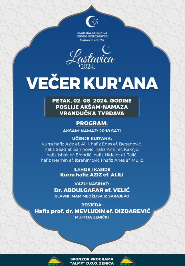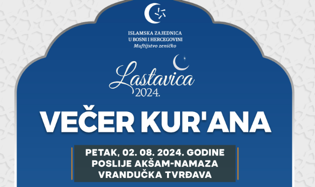 U sklopu programa Vjersko-kulturne manifestacije ” Lastavica 2024.″, u petak, 02. augusta 2024. godine u Vrandučkoj tvrđavi održati će se ”Večer Kur’ana”.