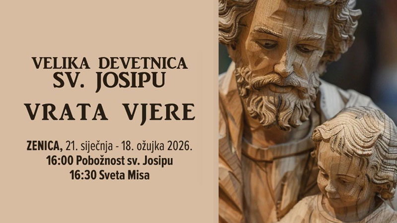 U župi sv. Josipa u Zenici u srijedu, 21. januara 2026., započinje tradicionalna Velika devetnica sv. Josipu, koja će se održavati kroz devet uzastopnih srijeda pod geslom „Vrata vjere“. Ova pobožnost, koja se u župi njeguje još od 1984. godine, okuplja brojne vjernike te zauzima posebno mjesto u vjerskom životu zeničkih katolika.