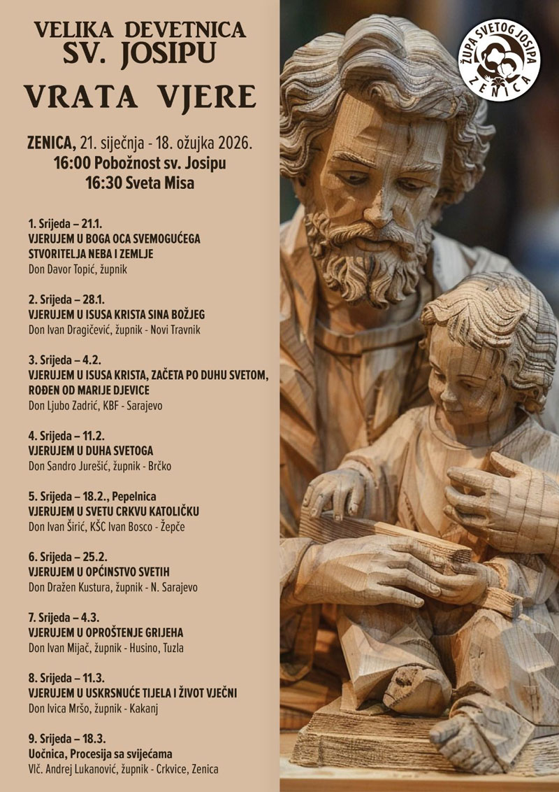 U župi sv. Josipa u Zenici u srijedu, 21. januara 2026., započinje tradicionalna Velika devetnica sv. Josipu, koja će se održavati kroz devet uzastopnih srijeda pod geslom „Vrata vjere“. Ova pobožnost, koja se u župi njeguje još od 1984. godine, okuplja brojne vjernike te zauzima posebno mjesto u vjerskom životu zeničkih katolika.