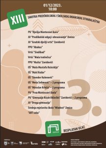 U petak, 1. decembra sa početkom u 11 sati održat će se XIII smotra predškolskog i školskog dramskog stvaralaštva u produkciji Dječije, omladinske i lutkarske scene Bosanskog narodnog pozorišta Zenica. Ovo je trinaesti put da Dječija scena Zeničkog pozorišta okuplja vrtiće, osnovne i srednje škole u zajedničkoj misiji njegovanja i propagiranja dramskog stvaralaštva. Svake godine, Zenički teatar u jednom danu postane središte dramskih sekcija i grupa Zeničko-dobojskog kantona.