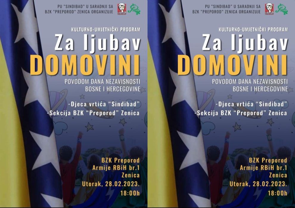 Svečanost pod nazivom “ Za ljubav DOMOVINI” će se održati 28.02.2022 godine u prostorijama BZK “PREPOROD” GD Zenica (Dom Armije), s početkom u 18:00h.