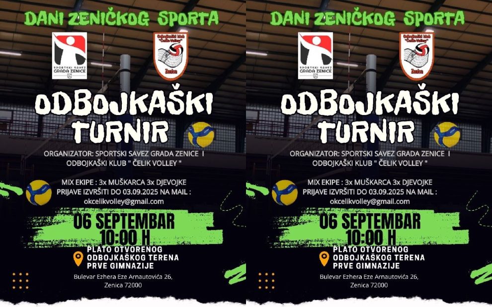 U sklopu manifestacije Dani zeničkog sporta, Sportski savez Grada Zenica i Odbojkaški klub Čelik-Volley Zenica organizuju mješoviti odbojkaški turnir na otvorenom, koji će se održati na terenu Prve gimnazije u Zenici.