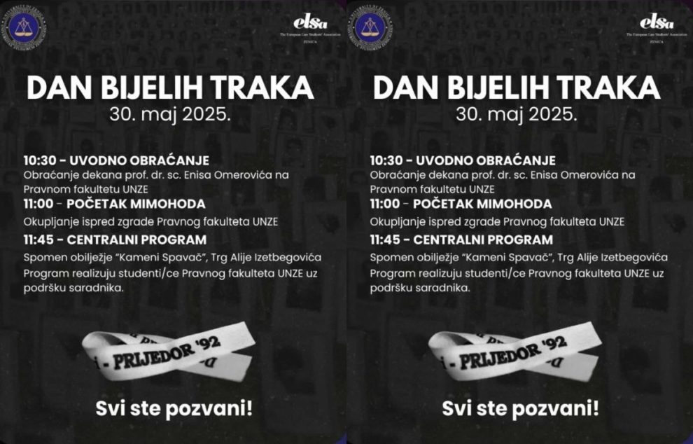 Pravni fakultet Univerziteta u Zenici (UNZE), u saradnji sa Evropskim udruženjem studenata prava – ELSA Zenica, nastavlja dugogodišnju tradiciju obilježavanja Dana bijelih traka, kao podsjećanje na zločine počinjene u Prijedoru tokom rata u Bosni i Hercegovini.