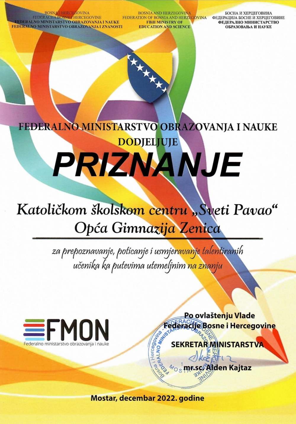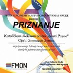 -Velika nam je čast da je Federalno ministarstvo prepoznalo rad i zalaganje naših djelatnika kako u obrazovanju tako i odgoju učenika. Radost ovog uspjeha želimo podijeliti sa dragim učenicima, roditeljima i djelatnicima, jer smo sve ovo zasigurno zajedno ostvarili, kaže ravnatelj KŠC-a don Vlatko Rosić.