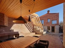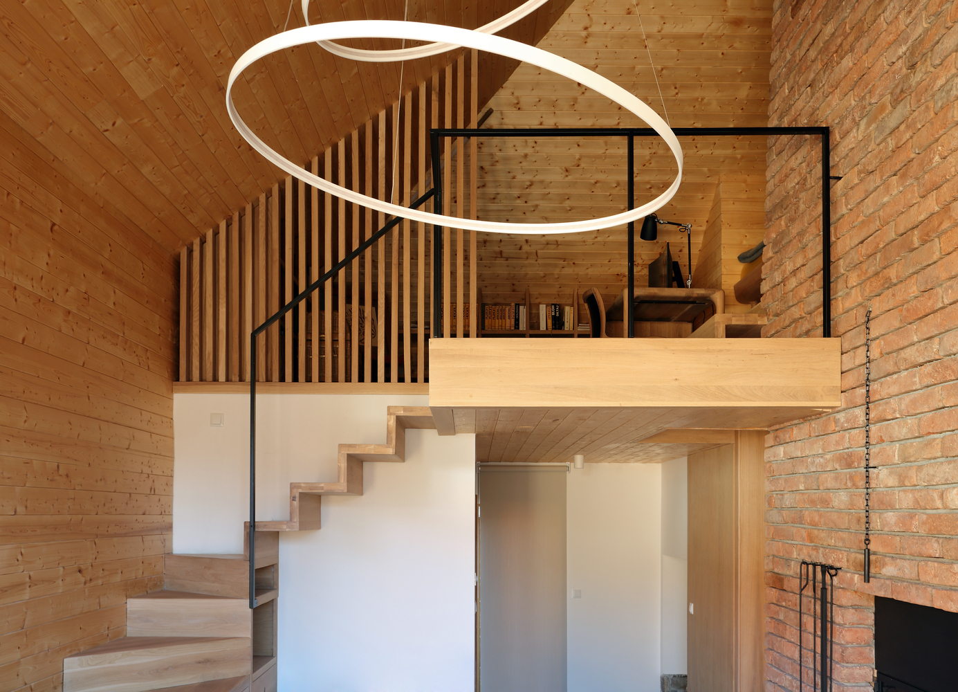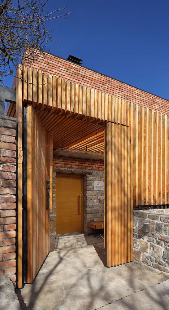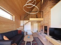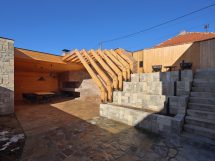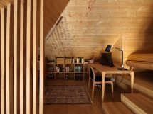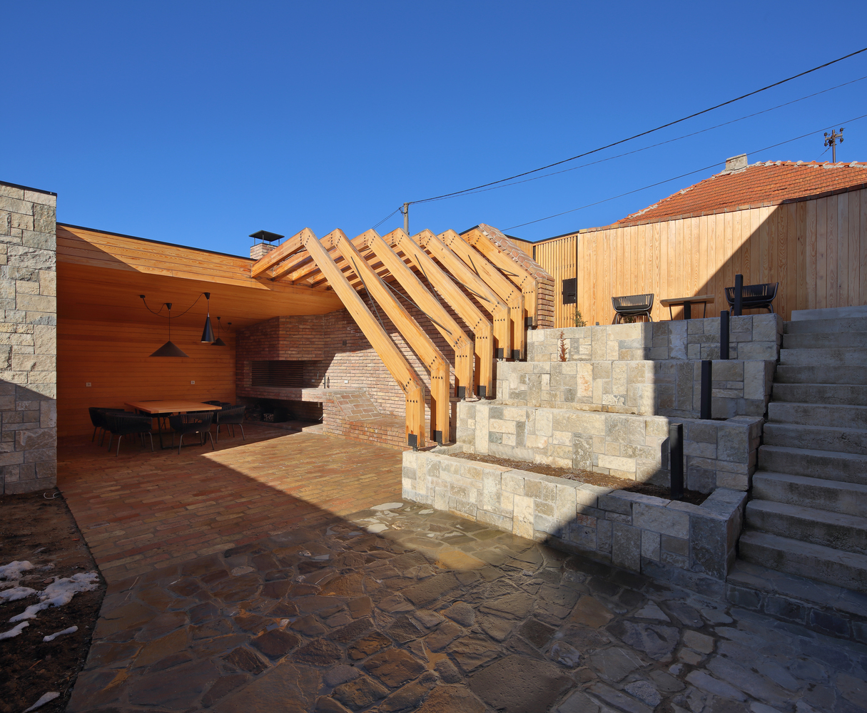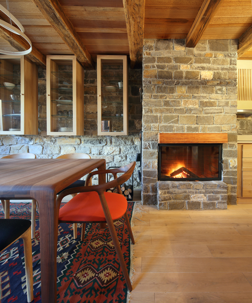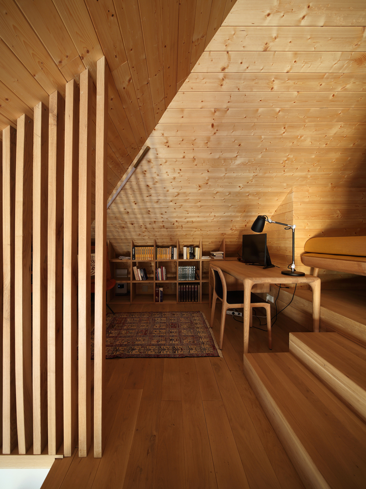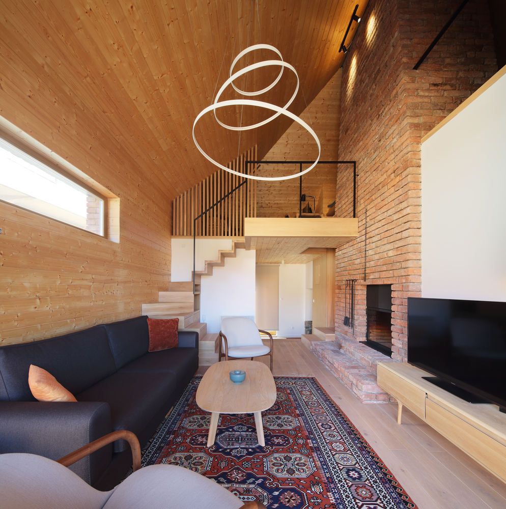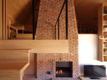 Četverovodni krov i centralno ognjište su korijeni tradicionalnih kuća na ovom području. Izrađujemo ponovo, samo bez strehe. Ovdje je također primijenjen princip centralnog kamina sa kamenim kaminom u prizemlju i zidanim na katu kao reminiscencijom na izvorne materijale od kojih je kuća napravljena. A centralni dimnjak izlazi na vrh četverovodnog krova. Krov nije zatvoren iznutra već je ostavljen kao galerija i biblioteka.