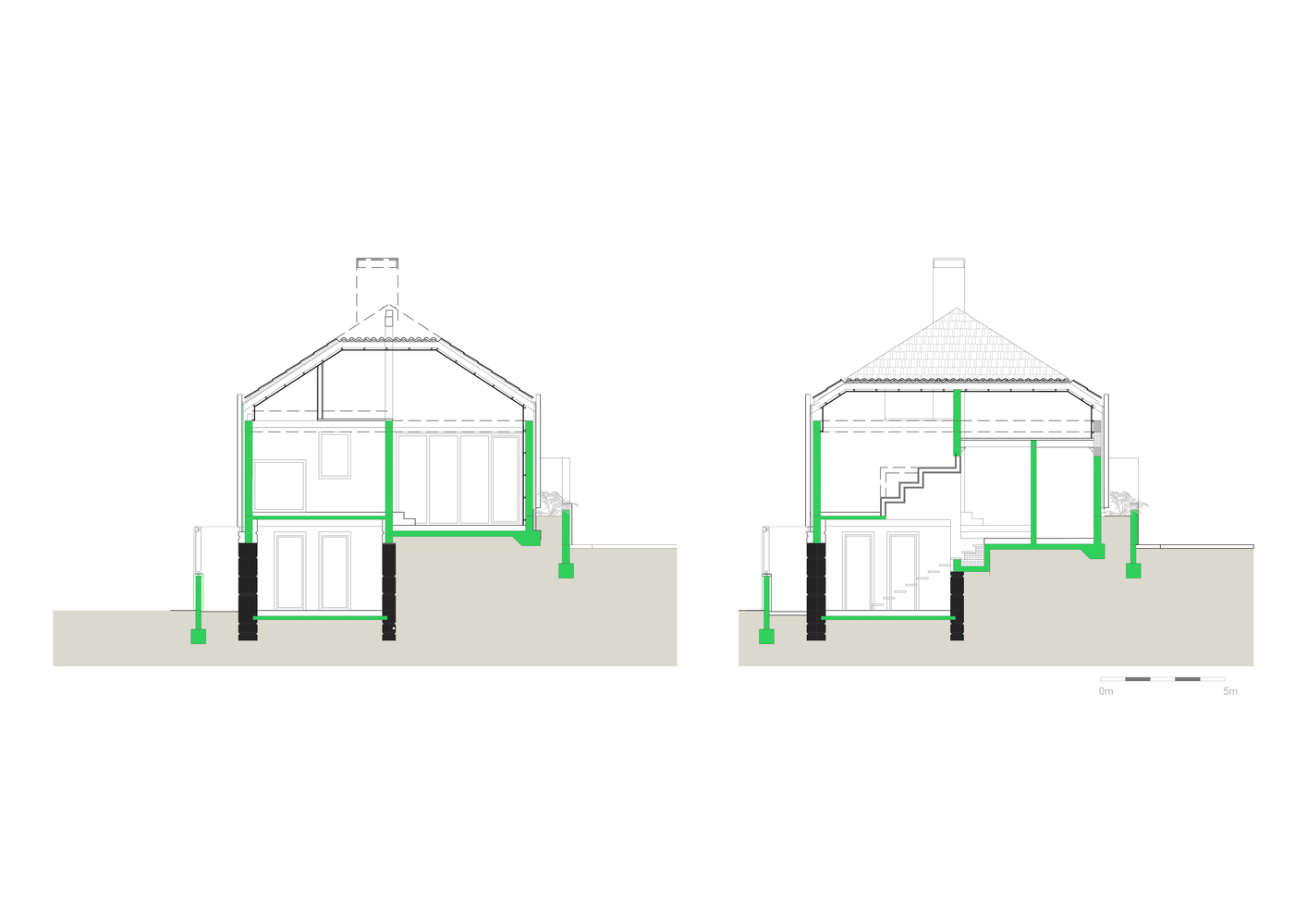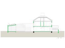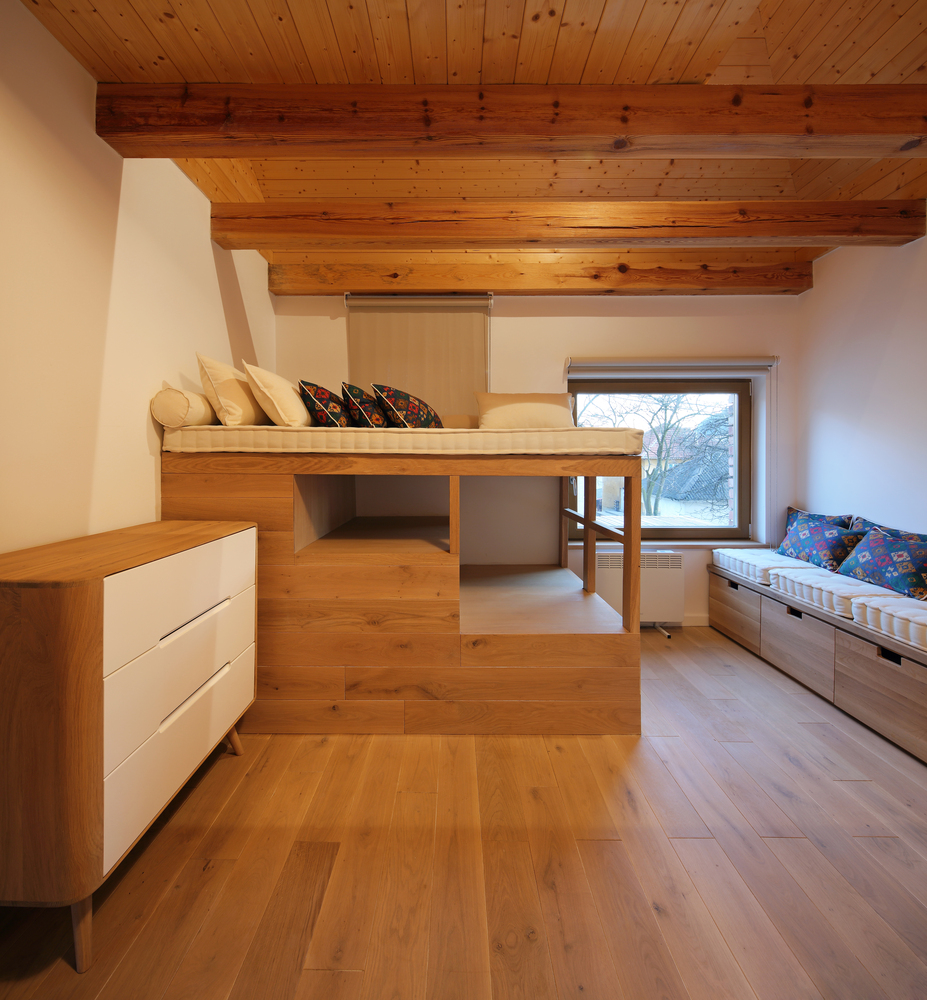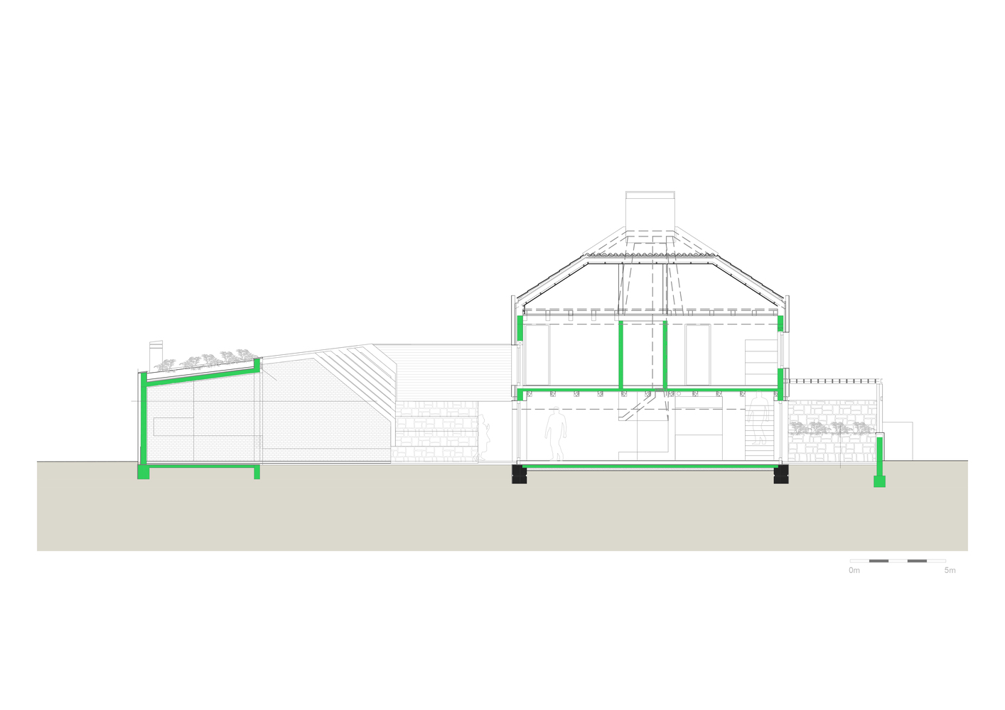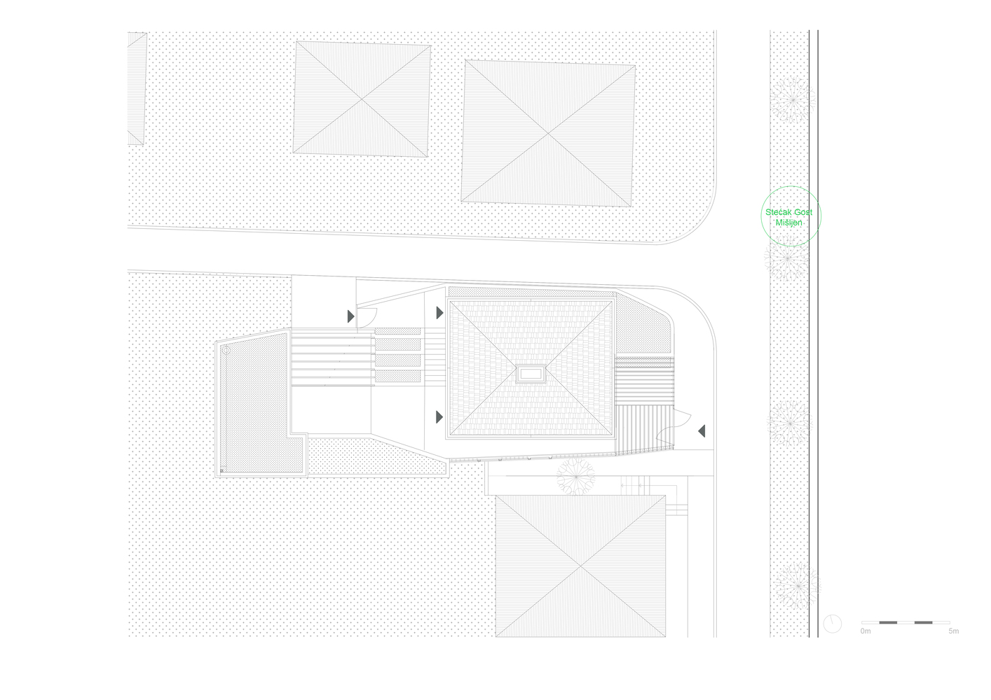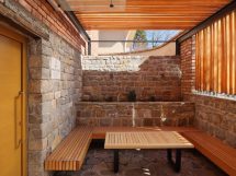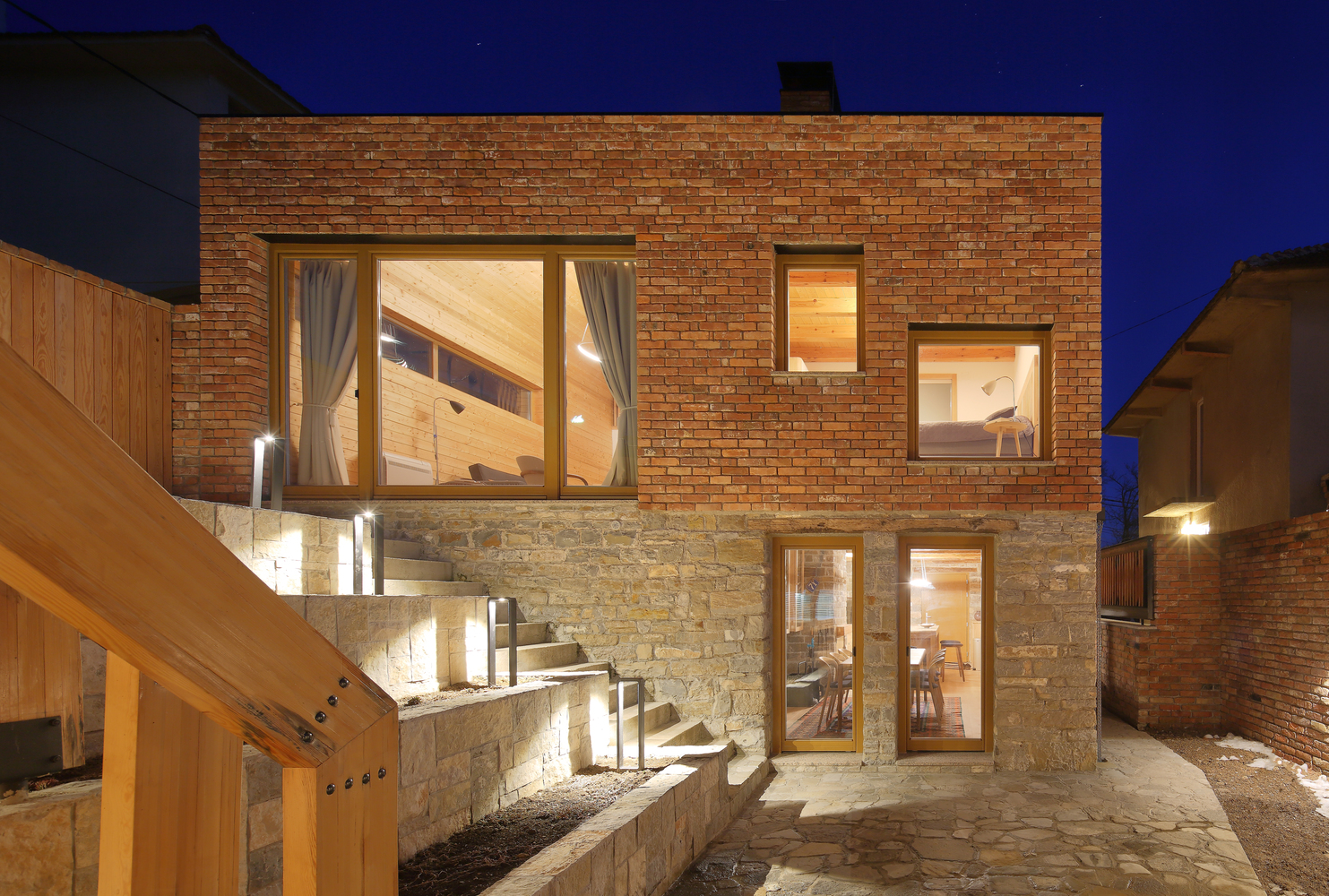 Četverovodni krov i centralno ognjište su korijeni tradicionalnih kuća na ovom području. Izrađujemo ponovo, samo bez strehe. Ovdje je također primijenjen princip centralnog kamina sa kamenim kaminom u prizemlju i zidanim na katu kao reminiscencijom na izvorne materijale od kojih je kuća napravljena. A centralni dimnjak izlazi na vrh četverovodnog krova. Krov nije zatvoren iznutra već je ostavljen kao galerija i biblioteka.