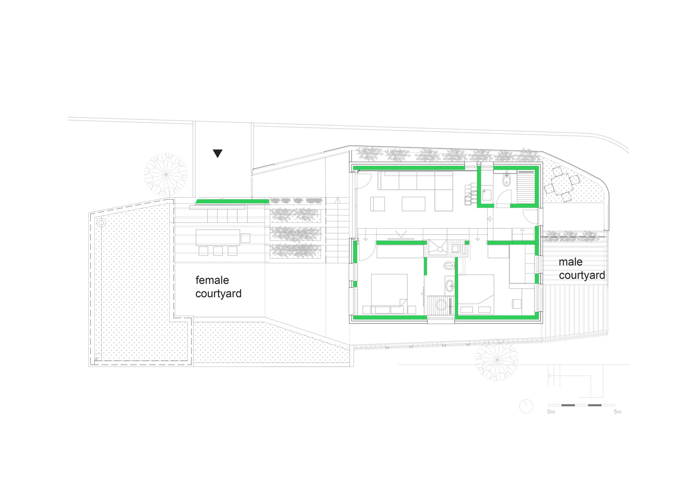 Analizirajući staru bosansku kuću, vratili smo se njenim osnovnim principima iz “bogumilskih” vremena – jedna prostorija, centralno ognjište, četverovodni krov. Kuća se rušila paralelno sa projektiranjem. Otkriveno je da se postojeća magaza može zadržati jer je ispod maltera otkriven veoma zdrav kamen. Sačuvana je sva cigla sa zidova, takozvana austrougarska, ali je dobila ulogu fasadne obloge na novoj zgradi. Sačuvane su stare hrastove stropne grede, ispune između greda, kao i nadvratnici prozora i vrata. Tipološki, kuća ostaje u istim dimenzijama, a slijedeći tradiciju stare bosanske kuće, dobija muško – prednje i žensko – stražnje dvorište. Muško dvorište je javno, ispred kuće. Žensko je intimno, privatno i opuštajuće uz vodu i cvjetni miris. I rušenje i gradnju radili su domaći majstori na čelu sa zanatlijom Sifetom.