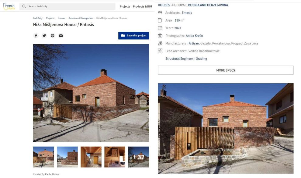 Najposjećenija arhitektonska web stranica u svijetu ArchDaily ovih dana je objavio članak o arhitektonskom i građevinskom projektu u Zenici, kući “Hiža Mišljenova” u Puhovcu kod Zenice, koji je projektirao zenički studio Entasis, potvrđeno je Zenicablogu.