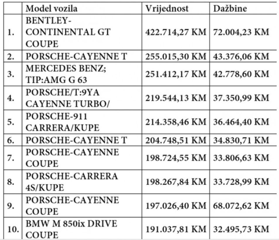 “Drugi najskuplji uvezeni automobil je Porsche-Cayenne T, koji je plaćen 255.015,30 KM, plus dažbine 43.376,06 KM. Treći skupocjeni automobil koji je uvezen je Mercedes-Benz tip AMG G 63, koji je koštao 251.412,17 KM, plus dažbine 42.778,60 KM”, podatak je UIO BiH.