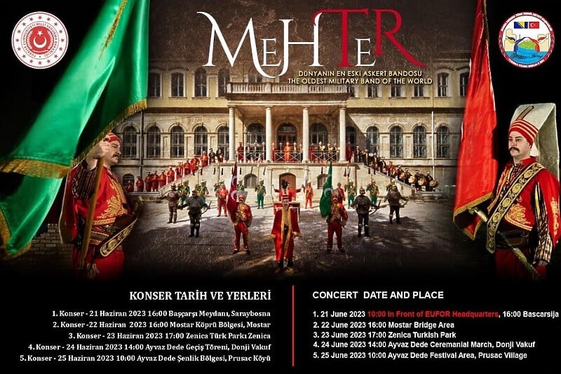 Turski vojni orkestar Mehteran koji djeluje u sklopu Ministarstva odbrane Republike Turske, a koji slovi za najstariji vojni orkestar na svijetu, održat će niz koncerata u BiH od 21. do 25. juna 2023. u organizaciji turske vojne misije u BiH.