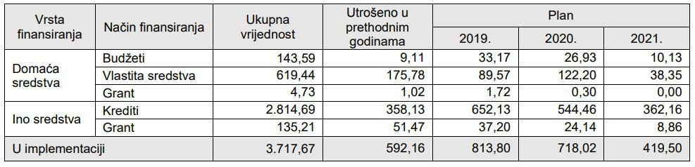 Kako je navedeno u Programu projekti u implementaciji finansiraju se domaćim i ino sredstvima. Domaća sredstva su budžetska sredstva, prihodi prikupljeni od GSM licence, sredstva kantona, gradova, opština, javnih preduzeća, fondova, domaćih banaka i krajnjih korisnika namjenjena za finansiranje ili sufinansiranje projekata.