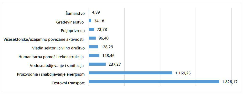 Najveća ulaganja su planirana u cestovni transport, potom snadbijevanje energijom, vodosnadbjevanje i sanitaciju, humanirarna pomoć i rekonstrukcija, Vladin sektor i civilno društvo, višesektorske-uzajamno povezane aktivnosti, poljoprivredu, gađevinastvo i šumarstvo.