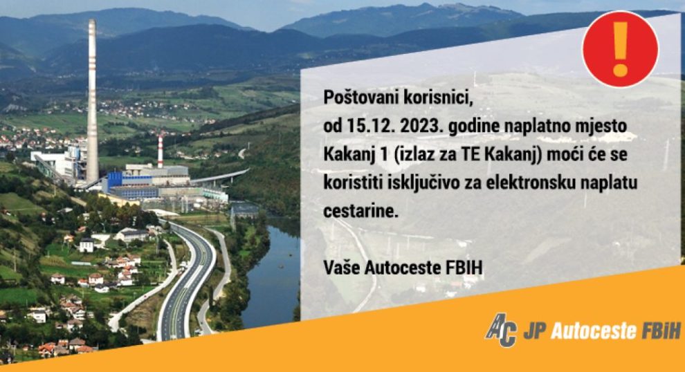 Od 15.12.2023. godine naplatno mjesto Kakanj 1 (Papratnica – izlaz za TE Kakanj) moći se koristiti isključivo za elektronsku naplatu cestarine.
