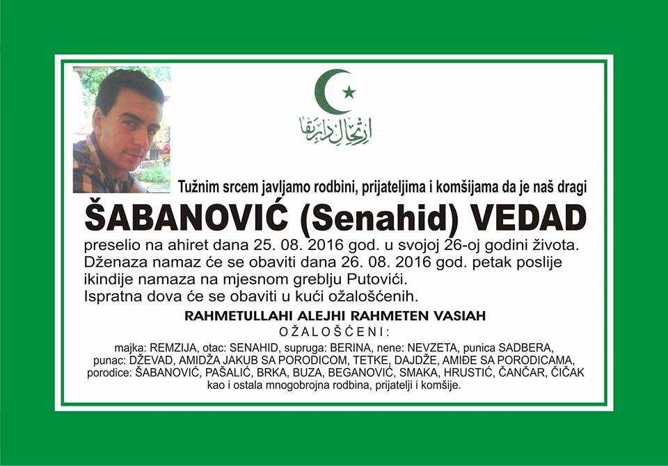 Napustio nas je naš Vedo, dženaza u Putovićima – Zauvijek nas je napustio naš sugrađanin Vedad Šabanović. Nakon višemjesečne teške oboljenja od leukemije, nažalost, izgubio je bitku za svoj mladi život.