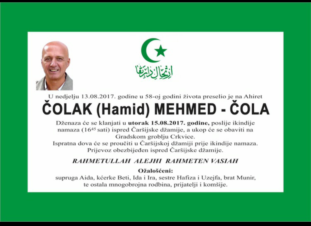 Napustio nas je zauvijek naš Mehmed Čolak Čola, dženaza u utorak poslijepodne
