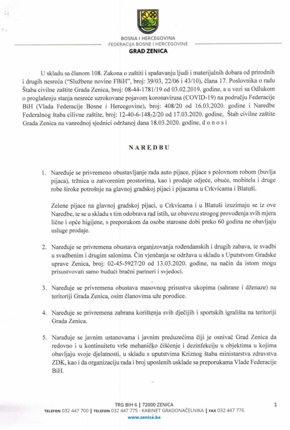 NAREDBA STABA CIVILNE ZASTITE GRADA ZENICA