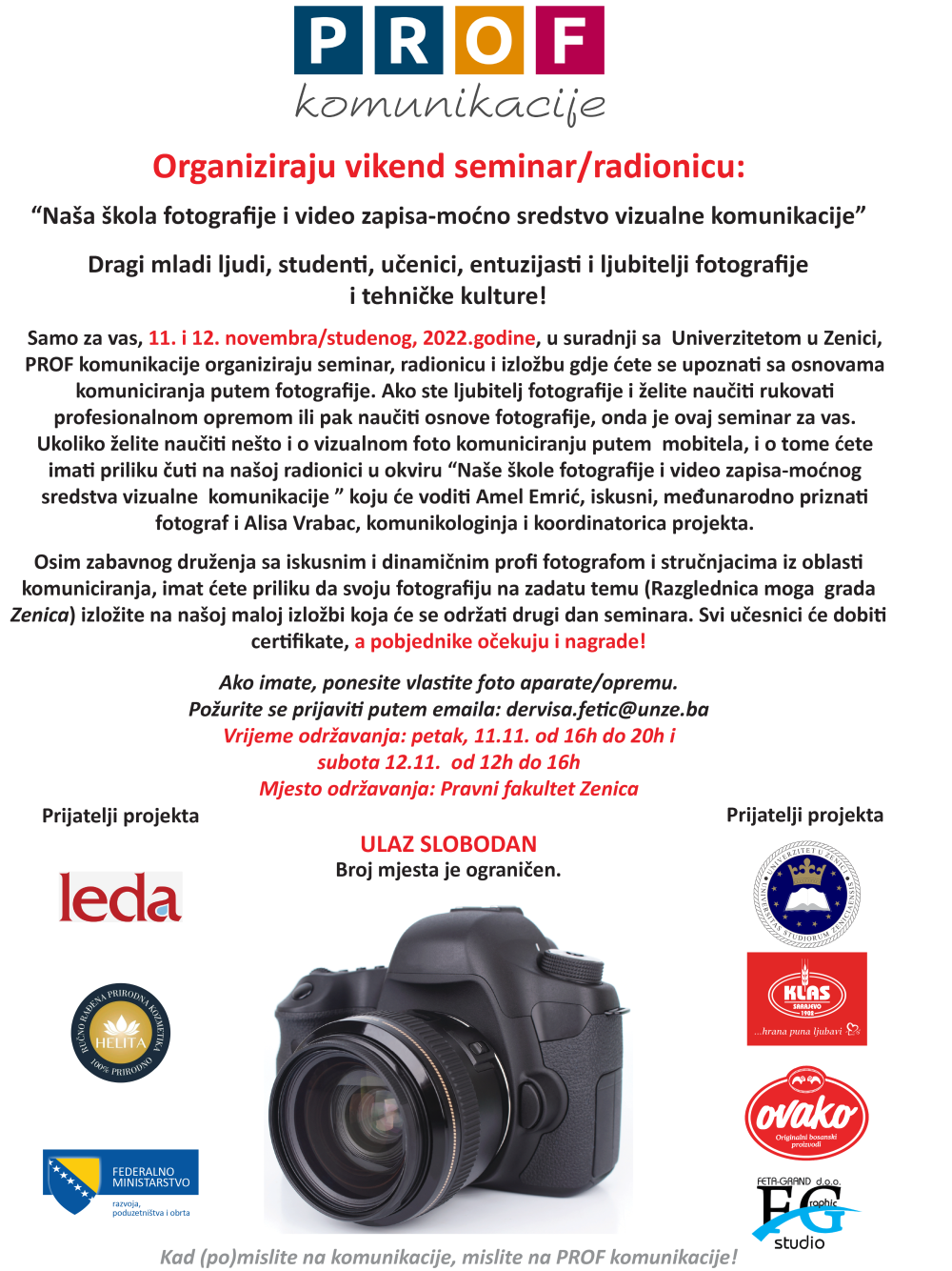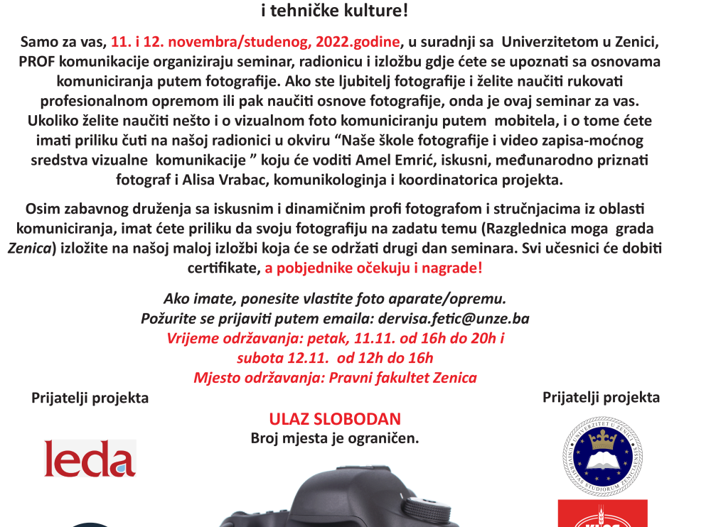Prof komunikacije i Univerzitet u Zenici organizuju još jednu radionicu/ seminar Naša škola fotografije i videozapisa koja će se održati u petak 11.11.2022. i subotu  12.11.2022. godine na Pravnom fakultetu.