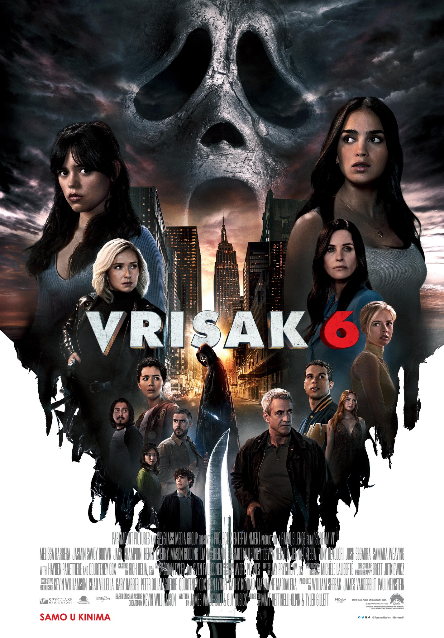 O FILMU: Nakon posljednjih ubistava koje je počinio Ghostface, četvoro preživjelih napuštaju Woodsboro i započinju novo poglavlje. U filmu VRISAK 6 Melissa Barrera („Sam Carpenter “), Jasmin Savoy Brown („Mindy Meeks-Martin “), Mason Gooding („Chad Meeks-Martin”), Jenna Ortega („Tara Carpenter “), Hayden Panettiere („Kirby Reed“) i Courteney Cox („Gale Weathers“) vraćaju se svojim ulogama u ovoj franšizi, zajedno sa Jackom Championom, Henryem Czernyem, Lianom Liberatoom, Dermotom Mulroneyem, Devynom Nekodaom, Tonyem Revoloriem, Joshom Segarraom i Samaraom Weavingom.