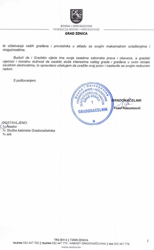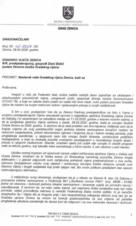 Nastavak rada Gradskog vijeća Zenica – Gradonačelnik Zenice Fuad Kasumović uputio je dopis Gradskom vijećuZenica u kojem traži da Gradsko vijeće nastavi s radom i održavanjem sjednica.