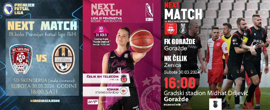 Donosimo Raspored utakmica zeničkih ekipa i sportskih događaja za ovaj vikend, 30.3. – 31.3.2024.godine, do kojeg smo uspjeli doći preko objavljenih nominacija, Saveza i klubova.