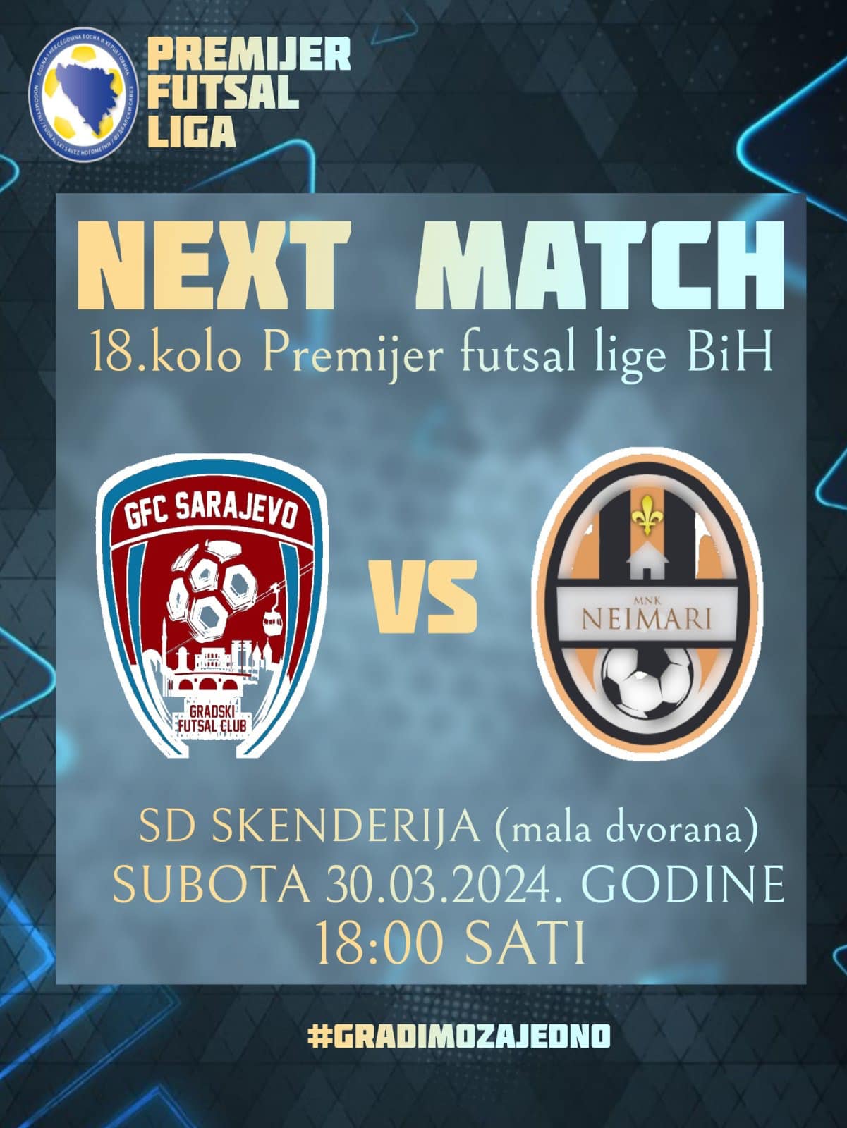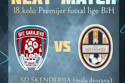 18 sati, Sarajevo: G.F.C. Sarajevo – MNK Salines-Neimari, 18.kolo Premijer futsal lige BiH (SD Skenderija-mala dvorana);