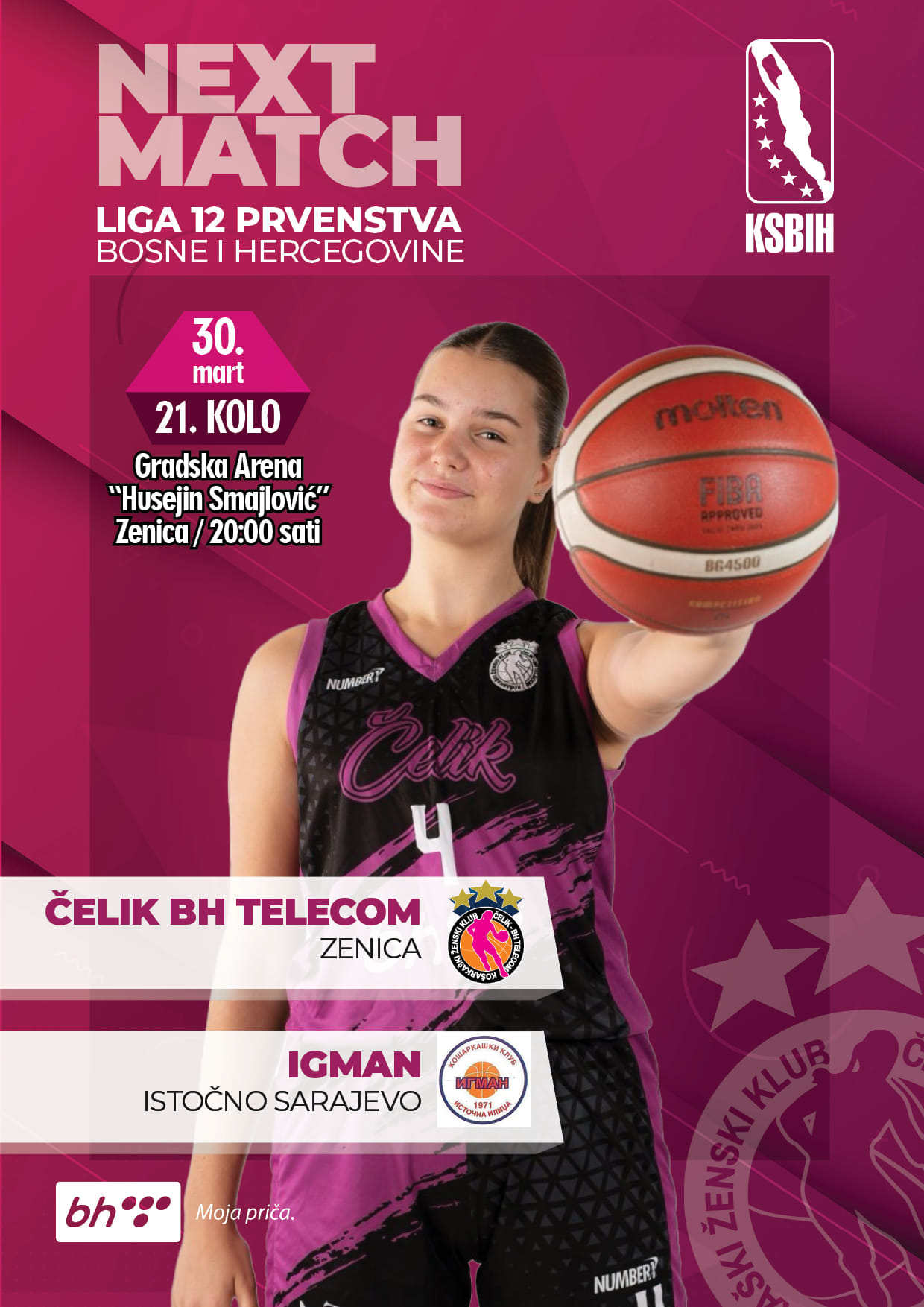 20 sati, Zenica: KŽK Čelik BH Telecom – ŽKK Igman Istočna Ilidža, 21.kolo bh. prvenstva u košarci za žene – Liga 12, (Gradska Arena „Husejin Smajlović“ Zenica);