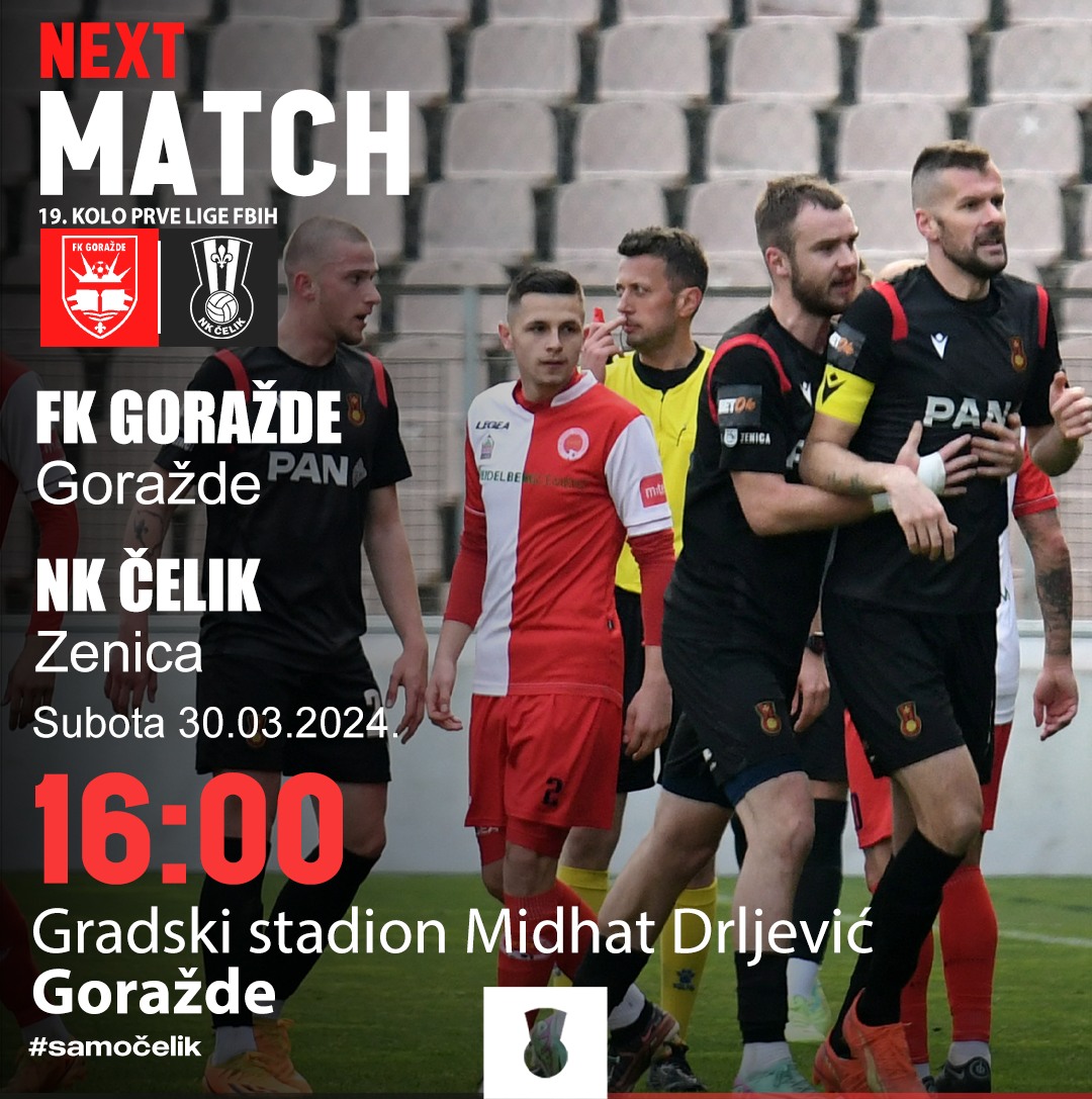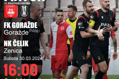 16 sati, Goražde: FK Goražde – NK Čelik, 19.kolo Prve lige FBiH, stadion „Midhat Drljević“ Goražde;