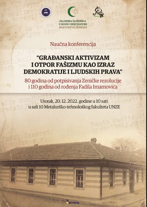 Naučna konferencija pod nazivom “Građanski aktivizam i otpor fašizmu kao izraz demokratije i ljudskih prava – 80 godina od potpisivanja Zeničke rezolucije i 110 godina od rođenja Fadila Imamovića“ bit će održana u utorak 20. decembra 2022. godine u sali 10 Metalurško-tehnološkog fakulteta u Zenici, s početkom u 10 sati.
