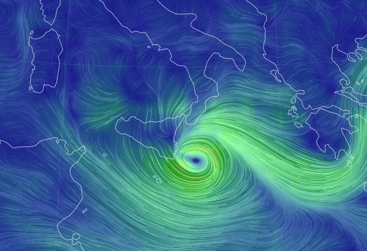 Mediteranski uragan se lijepo može uočiti i na našoj vizualizaciji zračnog pritiska svedenog na nivo mora, gdje je oslikan centar nad Sicilijom.
