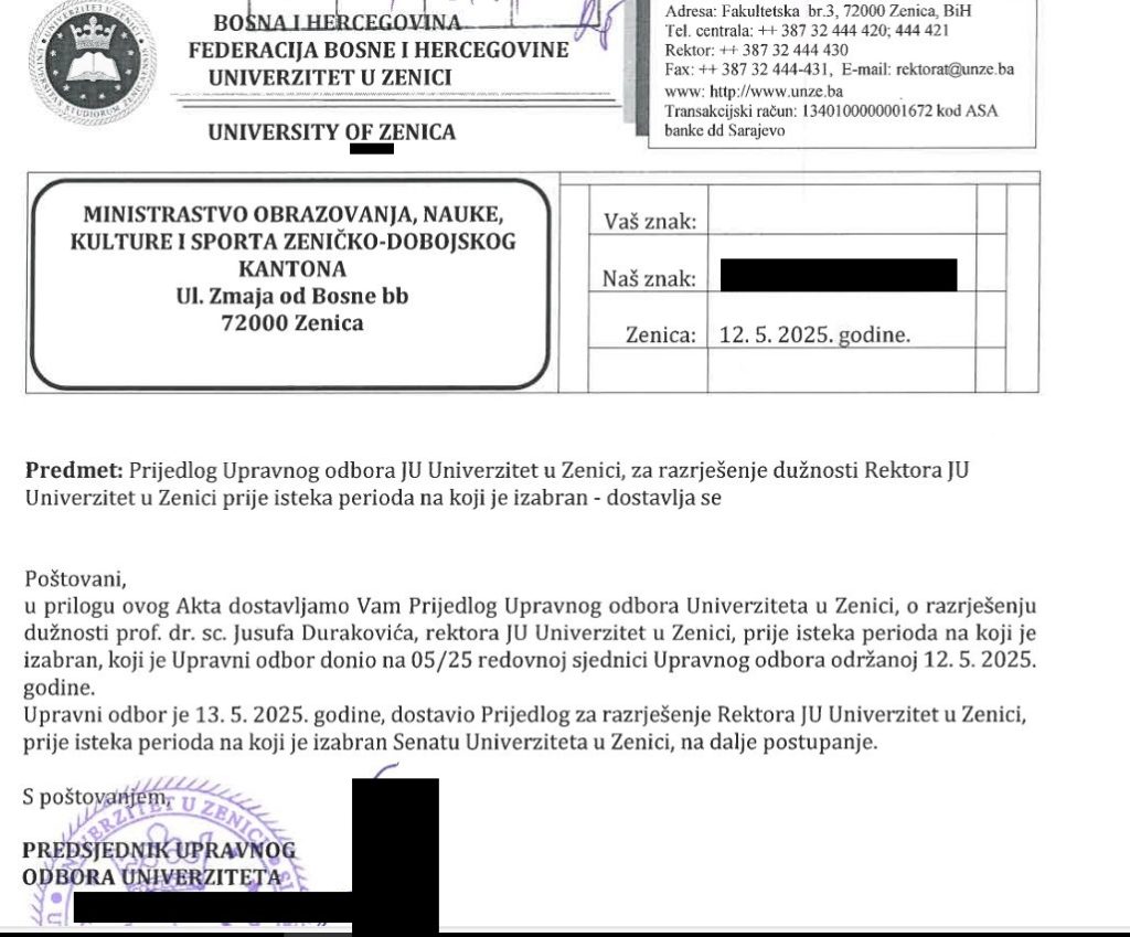 Na Univerzitetu u Zenici (UNZE) uzavrela atmosfera se ne stišava – Upravni odbor ove javne visokoškolske ustanove uputio je Senatu zvaničan prijedlog za razrješenje rektora, navodeći niz ozbiljnih nepravilnosti i propusta u njegovom radu.