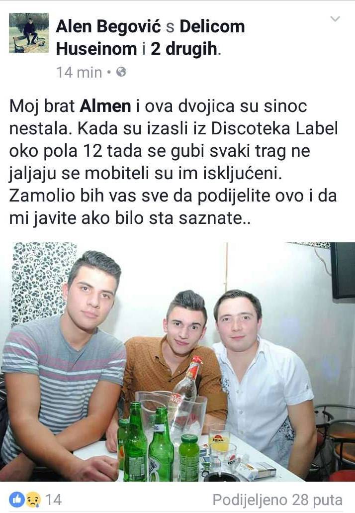 Nestala trojica mladića iz Zenice, porodice mole za pomoć – Porodice Delić, Begović i Kozlić mole sve građane da im pomognu u pronalasku njihovih sinova, kojima se gubi svaki trag od subote. Husein Delić, Almen Begović i Amar Kozlić (21) iz Zenice izašli su sinoć u diskoteku “Label” u Vitezu, a posljednji put na Facebooku su se oglasili u 21.20 sati.
